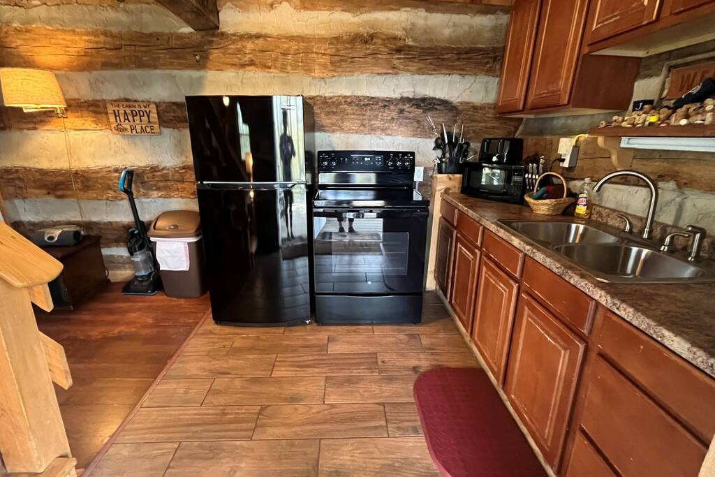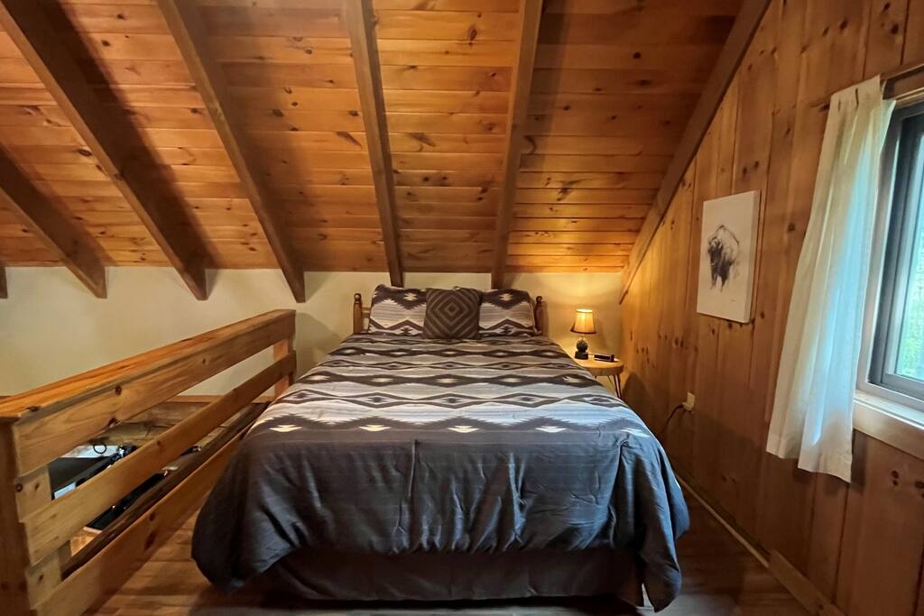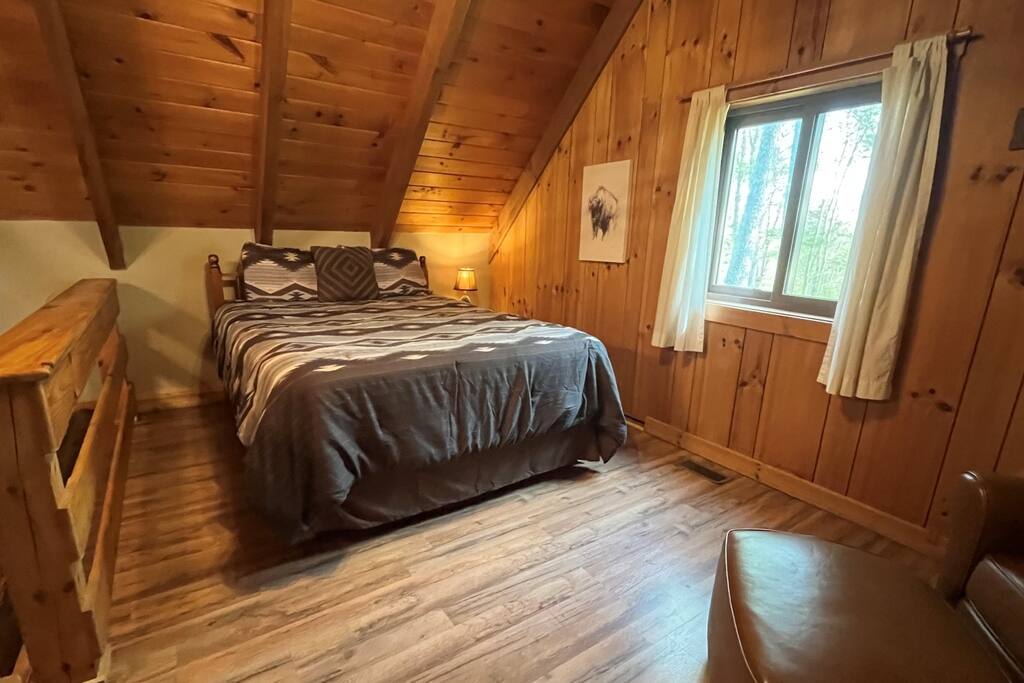 Frontier Log Cabin is an 1860's rustic cabin, situated on a beautiful, wooded hill. Frontier has a loft style bedroom with queen size bed. There is a nicely stocked kitchenette with refrigerator and convection oven. We offer hi-speed Wi-Fi. Both the loft bedroom and the downstairs living room have flatscreen TVs. Enjoy the privately located hot tub year around. Bring your furry friend to our DOG FRIENDLY property (pet fees apply). Nicely located in the Heart of Hocking Hills!